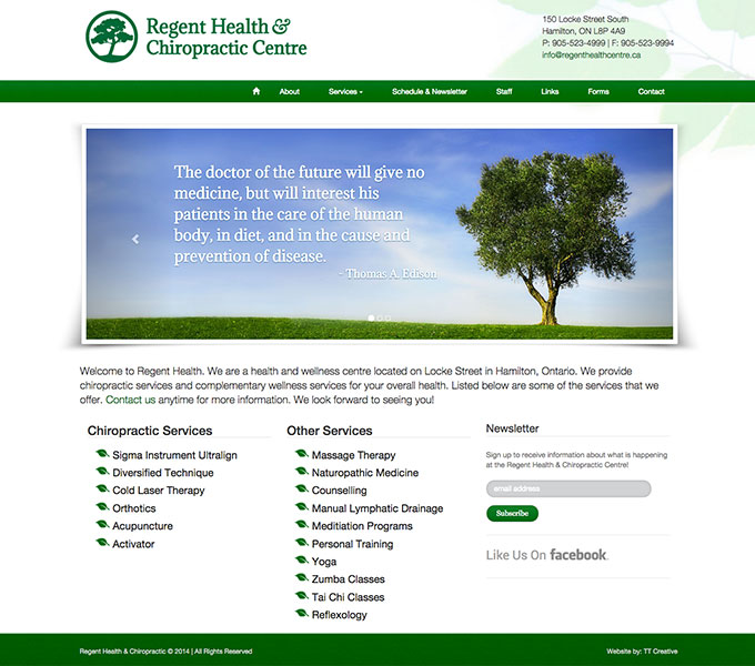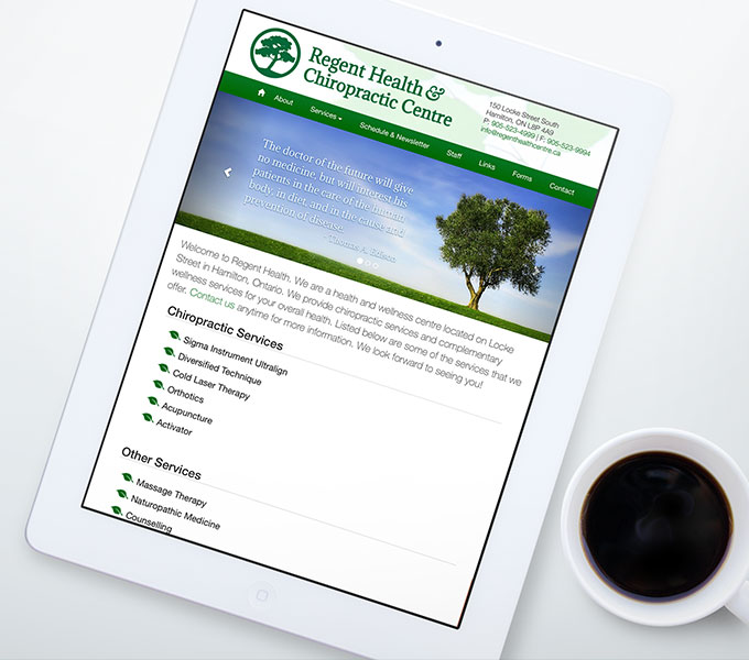 The Regent Health & Chiropractic Centre on Locke Street in Hamilton needed a new website and branding. They were already using various tree images in their advertising, but did not have a logo that they could call their own. I created one for them.